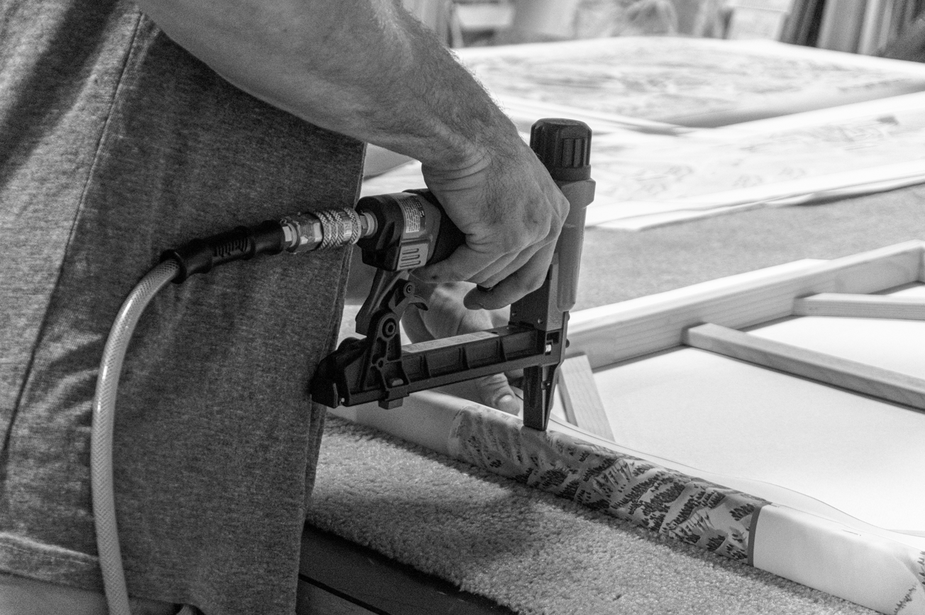 Gallery wrapped, by hand, onto a solid wood frame. Available here.