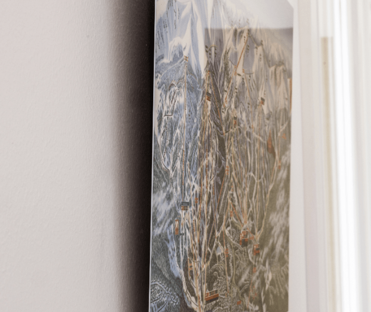 The gallery wrapped canvas giclée is a high-resolution reproduction ski map that has been printed on 240g heavy polyfiber canvas. The canvas is then hand-stretched onto a solid hardwood frame. We use UV resistant inks to make sure the print is vibrant, detailed, and resilient.